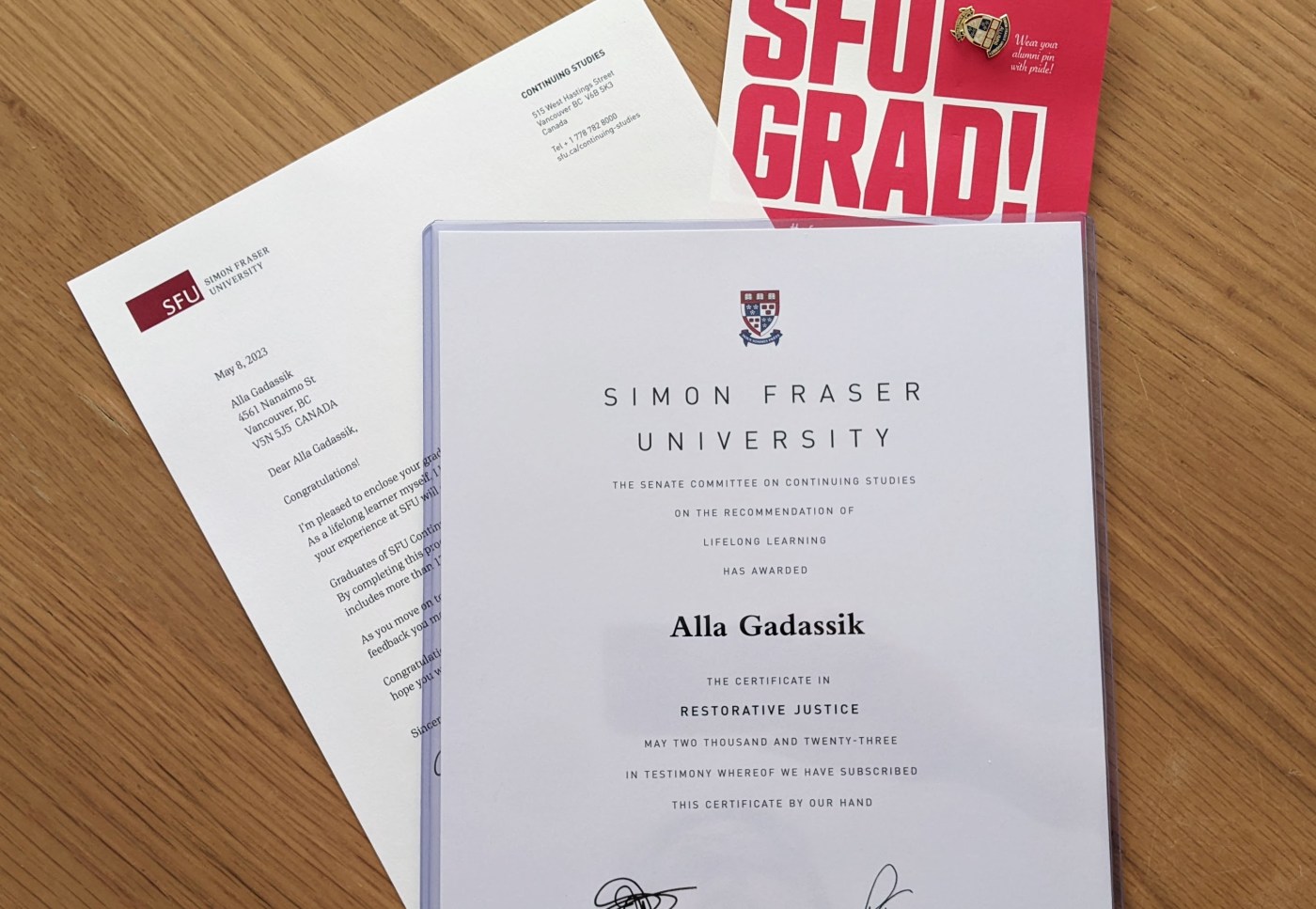 It’s official, I completed my Certificate in Restorative Justice (focus on Education)! This program is designed with an option to complete in one year, but it took me three years — between raising the funds, allowing myself time to really process the material, and coping with unexpected developments at my institution (which served as the primary case study and focus of my coursework). While the program itself was not necessarily a good fit, studying with Christianne Paras and Krystal Glowatski was a privilege. These amazing mentors were careful to remind us that restorative justice is not a panacea, particularly when it comes to contending with systemic and institutional violence. Everything I’ve learned has been transformative for my relationships with students, my classroom spaces, and the kinds of collegial initiatives I’ve sought out since then. I also get a kick at adding SFU to my list of ‘alumna’ institutions.